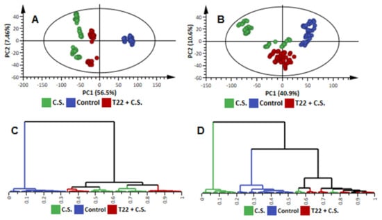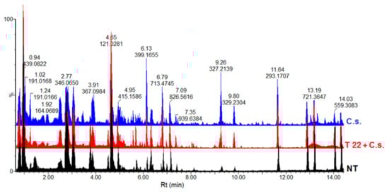 2.2. Comparative Analysis of the Metabolomic Profiles of P. alvei (T22)-Primed and Naïve Sorghum Plants Challenged with the Anthracnose Pathogen, Colletotrichum sublineolum