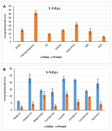 2.3.2. Defence Responses in Colletotrichum sublineolum-Challenged (Primed vs. Naïve) Sorghum Plants: Differential Changes in the Lipidome and Phenolics