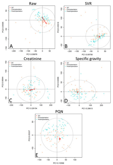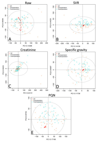 Unsupervised PCA plots comparing normalization approaches for HILIC data showing (A) raw data, (B) SVR-normalized data, (C) SVR and creatinine-normalized data, (D) SVR and specific gravity-normalized data, and (E) SVR and PQN-normalized data. Abbreviations: HILIC, hydrophilic interaction chromatography; SVR, support vector regression; PQN, probabilistic quotient normalization; PC1, principal component 1; PC2, principal component 2; ellipse is a 95% confidence ellipse.
