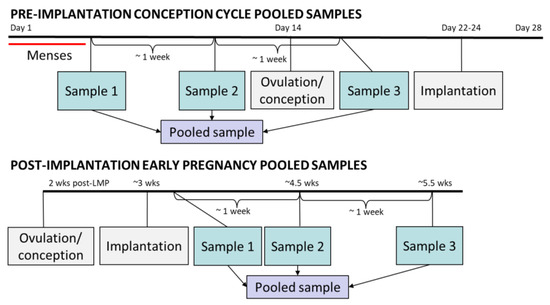 As part of a previous research study (NCT01132924) [42], stored daily urine specimens were pooled within menstrual cycles for each individual woman in order to facilitate the analysis of exposures to rapidly metabolized environmental chemicals with high intra-individual variability. Pools were created by selecting three first-morning specimens that were approximately one week apart, and that were collected after the end of menses. Equal aliquots were then drawn from each of these three specimens (Figure 3). The first two samples comprising the pool were pre-ovulation and the third was post-ovulation, but pre-implantation if a participant conceived. Together, these pooled samples reflect an individual’s entire menstrual cycle, and are referred to as “pre-implantation.” “Post-implantation” pooled samples consisted of three specimens approximately one week apart that were collected after the day of implantation. The post-implantation samples correspond to the first 3 to 6 weeks of gestation as measured from the LMP. For all 45 subjects, pooled urine samples from the conception cycle (pre-implantation sample) and from early pregnancy (post-implantation sample) were analyzed, for a total of 90 paired urine samples from two biological states.