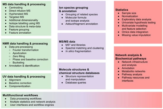 This review provides an overview of the metabolomics-related tools that are made available as packages (and a limited number of non-trivial, non-packaged scripts) for the statistics environment and programming language R [7]. We have included packages even if they are not anymore part of current CRAN or Bioconductor, i.e., they are available as archived versions only. We have not included packages described in the literature if they are no longer available for download at all. We did include packages that are currently available, but not yet published in the scientific literature. The package descriptions have been grouped in sections according to the typical steps in the metabolomics data analysis pipeline for different analytical technologies, following the typical workflow steps from MS, NMR and UV data analysis, metabolite annotation, statistical analysis, molecular structure, network and pathway analysis and finally covering packages embracing large parts of the workflow.