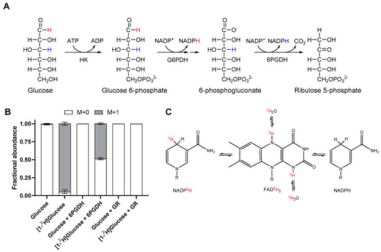 In addition to transfer of deuterium onto NADPH from labelled substrates, the redox active hydride of NADPH can be exchanged with water via a reaction catalysed by flavin-containing enzymes (Figure 1C) [36,37]. This occurs as hydrogen is transferred from a non-labile C–H bond in NADPH to a more labile N–H bond in FADH2 [36,37]. This can result in loss of label from the redox active hydride of NADPH following labelling with deuterated substrates such as [1-2H]glucose, leading to an underestimation of the contribution of the oxPPP to total NADPH production. This effect was confirmed in vitro by the addition of glutathione reductase (GR), a flavin-containing enzyme, to a mixture of HK and G6PDH supplied with [1-2H]glucose. This resulted in the production of 100% unlabelled NADPH due to complete equilibration of the redox active hydride with water (Figure 1B). Incubation of GR with NADPH in 75% D2O in the absence of any other substrates also resulted in equilibration of NADPH with water (Figure S1), confirming that catalytic turnover of flavin enzymes was not necessary for the exchange to take place. The results of these in vitro experiments confirmed that [1-2H]glucose could be used to label NADPH via the oxPPP and highlighted the need to correct for the water exchange caused by flavin-containing enzymes.