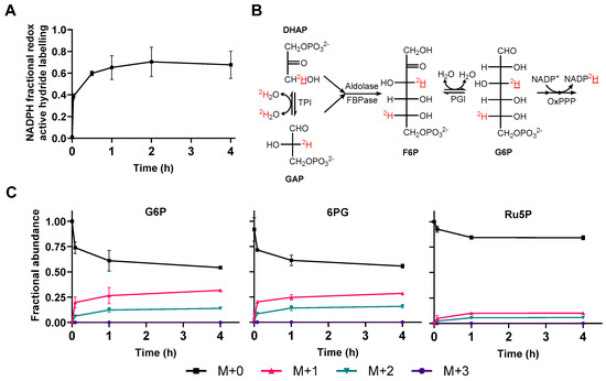 The following are available online at https://www.mdpi.com/2218-1989/9/10/205/s1, Figure S1: In vitro deuterium incorporation into NADPH from D2O catalysed by glutathione reductase, Figure S2: Abundance of NADP-flavin enzymes in A. thaliana compared to H. sapiens, Figure S3: NADH redox active hydride labelling following supply of D2O, Figure S4: NADP-flavin enzymes present in cell extracts, Figure S5: MIDs of metabolites following transfer to 100% [1-2H]glucose media, Figure S6: NADP(H) MIDs following transfer to 100% [1-2H]glucose media, Figure S7: NADH redox active hydride labelling following transfer to 100% [1-2H]glucose media, Figure S8: Spectral accuracy of NADP(H) MID measurement. Code used in this work is available online at www.github.com/tednsmith/Deuterium-Labelling-Arabidopsis.