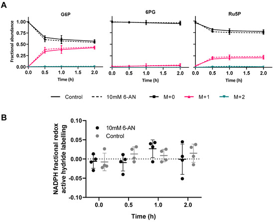 To establish if [1-2H] glucose can provide specific information about NADPH production from the oxPPP, despite the high rate of water exchange, heterotrophic Arabidopsis cells were transferred to media containing 100% [1-2H]glucose and the deuterium incorporation into NADPH and other metabolites was measured by LC-MS (Figure 3, Figures S5, S6). The effect of inhibiting the oxPPP using 6-aminonicotinamide (6-AN), an inhibitor of 6PGDH [44,45], was also investigated to determine if the expected NADPH labelling was dependent on the flux through the oxPPP.