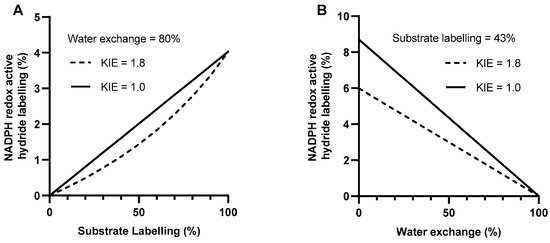 The simulated effect of substrate labelling (A) and water exchange fraction (B) on the NADPH redox active hydride labelling in the presence (---) or absence (–) of a deuterium kinetic isotope effect (KIE) calculated using Equations (1) and (2) (see Section 5.4). The oxPPP contribution to NADPH production was fixed at 40%. Water exchange was fixed at 80% whilst substrate labelling was varied (A) Substrate labelling was fixed at 43% whilst water exchange was varied (B) Calculations were performed using linear equations in MATLAB (see Supplementary Materials for link to code).