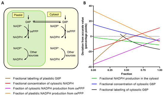 The effect of compartmentation on the measurement of the oxPPP contribution to total NADPH production. (A) Two compartment model simulating duplicated oxPPP in the cytosol and plastids. (B) The deviation of the experimentally measured value for a whole cell extract from the actual value for the oxPPP contribution to total cellular NADPH production. Each parameter was varied between 0 and 1 whilst all other parameters were fixed at the following values: fractional amount of cytosolic G6P, 0.85 [49]; fractional amount of cytosolic NADPH, 0.5 [50,51]; fractional NADPH production in the cytosol, 0.18 [29]; fraction of cytosolic NADPH production from oxPPP, 1.0 [29]; fraction of plastidic NADPH production from oxPPP, 0.9; fractional labelling of cytosolic G6P, 0.5; and fractional labelling of plastidic G6P, 0.4. The model was constructed using linear equations in MATLAB (see Supplementary Materials for link to code).
