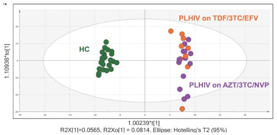 We identified 1114 bio-chemicals, of which 901 compounds were of known identity (named biochemicals) and 213 compounds of unknown structural identity (unnamed compounds). To analyze variations between the two groups, supervised analysis with orthogonal partial least square discriminant analysis (OPLS-DA) and unsupervised analysis with principal component analysis (PCA), which transforms a large number of metabolic variables into a smaller number of orthogonal variables, were performed. A clear separation between PLHIV and HC groups was seen, with more clustering in HC but scattered in PLHIV, and more association in the Tenofovir/Lamivudine/Efavirenz (TLE) regimen in OPLS-DA analysis (Figure 1). A similar separation between the two groups was also observed in the PCA analysis (Figure S1, Supplementary Materials).