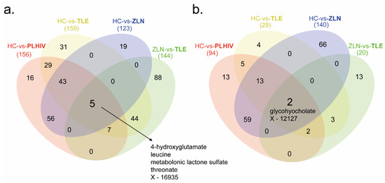 The t-tests identified 250 significantly different metabolite levels (p < 0.05, false discovery rate (FDR, q) < 0.10) between PLHIV and HC. Among the metabolites, 156 were lower (Figure 2a) while 94 were higher in PLHIV compared to HC (Figure 2b). While underpowered, within the PLHIV group, there were 164 significantly different metabolites [(144 lower and 20 higher in TLE compared to Zidovudine/Lamivudine/Nevirapine (ZLN)] between the individuals on TLE and ZLN treatment regimens (Figure 2b). There were five metabolites that were lower in PLHIV compared to HC and also lower in patients with TLE compared to the ZLN groups (4-hydroxyglutamate, leucine, metabolonic lactone sulfate, threonate, and X-16935, where X-16935 is a novel compound). All the significant comparisons presented in Venn diagrams are given in the supplementary data file 1.