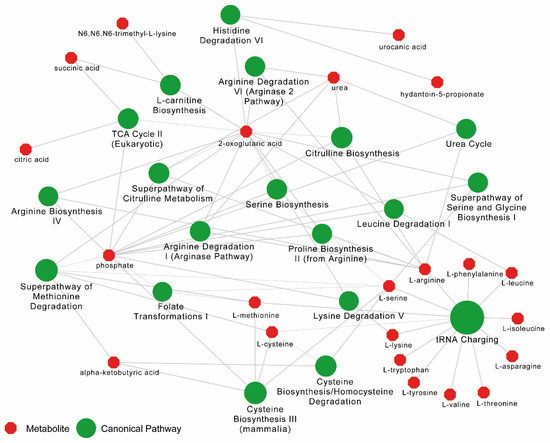 The pathway enrichment analysis was carried out in ingenuity pathway analysis (IPA) (Qiagen, Germany) with metabolites with the Human Metabolome Database (HMBD) IDs (n = 228 mapped). The functional annotation by canonical pathways associated with differential levels of metabolites revealed that top 20 pathways were mainly related to the differential level of amino acids (Figure 3).