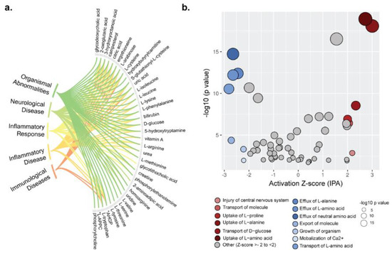 Metabolome annotation and biofunction analysis. (a) Metabolome annotation results obtained from ingenuity pathway analysis (IPA). The figure visualizes the most significant biological functions (p < 0.05) and corresponding metabolites. (b) Pathway enrichment analysis results from IPA for metabolome data. IPA generated activation z-scores in the x-axis and p-values in the y-axis. Bubble sizes are relative to p-values. A negative z-score implies significant downregulation of the pathway and vice versa.