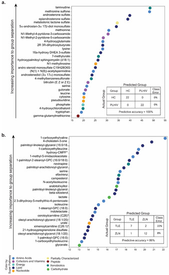 (a) Random forest (RF) analysis of named biochemicals resulted in predictive accuracies of 100% for HC vs. PLHIV. The biochemical importance plots display the top 30 metabolites which most strongly contribute to the groups’ separation for HC vs. PLHIV based on amino-acid metabolism, lipid metabolism, energy metabolism, co-factors and vitamins, peptides, and xenobiotics, as indicated in different colors in the legend. (b) The RF analysis of named biochemicals resulted in predictive accuracies of 86% for PLHIV-TLE vs. PLHIV-ZLN. The biochemical importance plots display the top 30 metabolites which most strongly contribute to the groups’ separation based on amino-acid metabolism, carbohydrate metabolism, lipid metabolism, nucleotide metabolism, and xenobiotics.