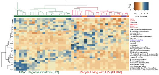 The hierarchical clustering of all the samples (HC and PLHIV) indicated negative z-scores for lysine, leucine, methionine tryptophan, and serine (marked in red), indicating lower levels in PLHIV compared to HC; however, methionine sulfone (marked in blue) had a higher level with positive z-scores in PLHIV.