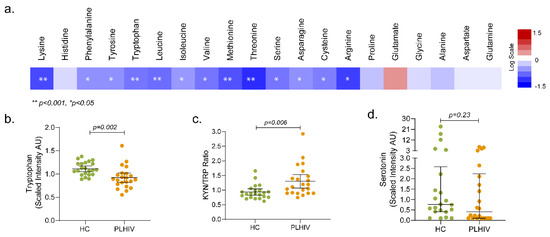 Metabolic pathways associated with HIV-1 infection following long-term therapy (a) Altered amino-acid metabolism. Amino acids (n = 20) that were significantly lower (in blue) or higher (in red) in PLHIV compared to HC. The level of tryptophan (b), Kyn/Trp ratio (c), and serotonin (d).