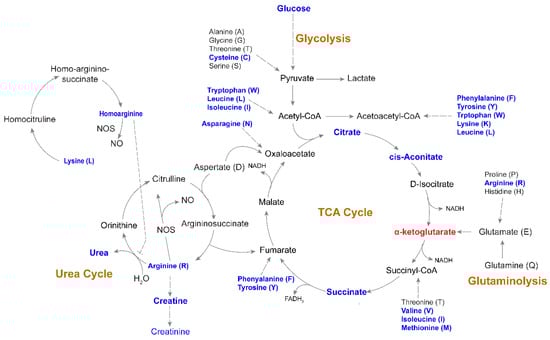 Glucose levels were significantly lower in the PLHIV compared to HC. Via a series of enzyme-catalyzed steps, glucose is metabolized to pyruvate which can either be oxidized in the mitochondria to enter the tricarboxylic acid cycle TCA cycle as acetyl Coenzyme A (CoA) or reduced to lactate by lactate dehydrogenase (LDH). Interestingly, the lower level of glucose did not result in lower pyruvate or lactate in the PLHIV group. The mitochondrial TCA cycle links the catabolism of carbohydrates, lipids, and some amino acids to ATP production via the supply of reducing equivalents through oxidative phosphorylation. In the current study, citrate, aconitate, and succinate were lower in PLHIV compared to HC (Figure 8). TCA cycle carbon can be supplemented by the glutaminolysis process, in which glutamine is converted to glutamate, then to α-ketoglutarate, which was higher in PLHIV subjects. It is possible that glutaminolysis supported α-ketoglutarate, as neither glutamate nor glutamine was altered in PLHIV. Likely because of decreased amino-acid levels, levels of urea cycle metabolites, including the amino-acid arginine and urea, were lower in PLHIV samples (Figure 8). Homoarginine was also lower in the PLHIV group, but citrulline was not different. These data suggest that PLHIV would produce lower nitric oxide. However, this would need to be assessed in a cell-based assay.