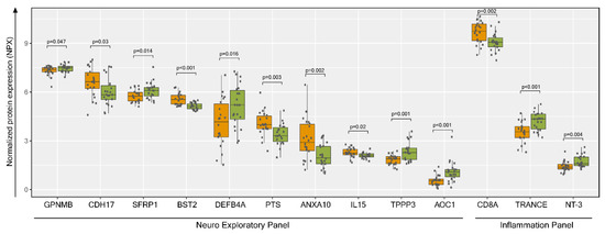 The plasma metabolomics profile indicated a higher risk of inflammatory and neurological diseases in PLHIV. We next performed plasma proteome profiling targeting 184 proteins in two Olink® panels: inflammation targeting inflammation-related proteins and neuro-exploratory, targeting neurology-related diseases, and biological processes such as axon development, neurogenesis, and synapse assembly. Among the proteins analyzed, 11 from the neuro-exploratory and three from the inflammation panel were significantly different between the groups (Figure 9).