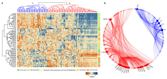 (a) Pearson correlation coefficient visualization and hierarchical clustering between metabolites and proteins. Metabolites belonging to various categories were plotted in rows and proteins in columns. (b) Protein–protein interaction results between two clusters of proteins from correlation clustering. Blue elements are cluster-1 proteins, and red elements are cluster-2 proteins. Bubble size is relative to the number of interactions, and each ribbon implies an interaction.