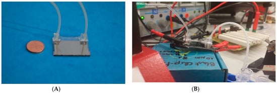(A) Manufactured chip for irreversible electroporation. Two glass slides with platinum metallization are bonded together. A meander-type microfluidic channel is embedded between the two slides. Inlet and outlet tubes are connected via custom-made poly(dimethylsiloxane) (PDMS) connectors. (B) Experimental setup. The inlet tube is on the left side of the chip; the outlet tube on the right feeds directly into an Eppendorf tube (here not ice-cooled). In the background, the board (right) and the electronic equipment is shown. For both pictures: Footprint of the chip: 32 × 26 mm.