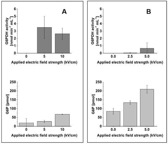 Influence of different electric field strengths on the activity of the enzyme glucose-6-phosphate dehydrogenase (G6PDH) and the amount of glucose-6-phosphate (G6P) from E. coli ((A), left column) and S. cerevisiae ((B), right column). The dark and light grey colored bar charts denote, respectively, the activity of the enzyme G6PDH and the amount of G6P at the given electric field strengths. The data were obtained from three biological replicate experiments performed with three different microfluidic chips. The error bar represents the standard deviation calculated from the biological replicates.