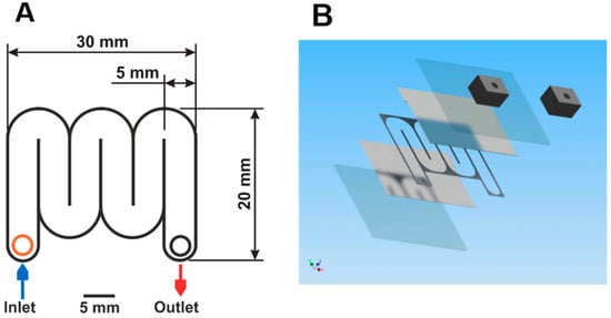 (A) Top view onto the microfluidic chip. The meander-type channel has a width of 5 mm, a length of 120 mm, and a height of 10 or 20 µm. Top and bottom of the channel consist of glass slides covered with platinum. Overall chip dimensions: 30 × 20 × 1 mm. (B) Exploded 3D view of the chip. From bottom to top: glass substrate, platinum layer, SU-8 with a serpentine channel, platinum layer, glass substrate, PDMS connectors for inlet and outlet.