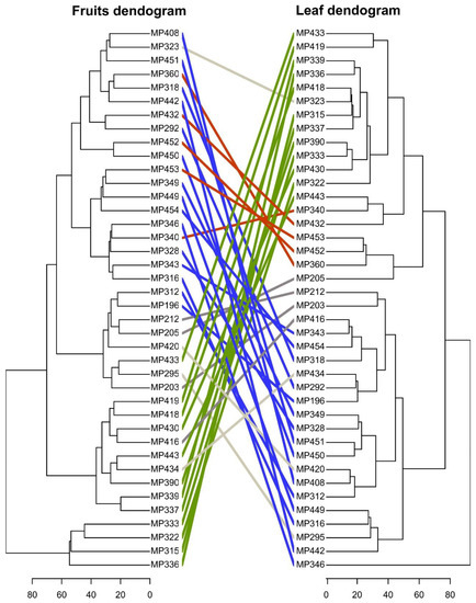 The tanglegram compares the hierarchical clustering of mother plants employing fruits versus leaves metabolite profiles. Individual dendrograms were calculated using hierarchical clustering with the ward.D2 method. The signal intensity of every peak mass used for generation of dendrograms consisted of the average of three technical replicates.