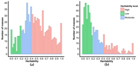 Frequency distribution of heritability of mass peaks detected in fruits (a) and leaves (b). The histograms demonstrate the distribution of the heritability level. Colors depict values according to low, moderate and high heritability levels.
