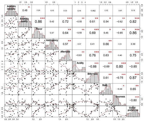 The correlation plot shows histograms and density distribution of cup quality attributes of coffee beverage. The Spearman correlation coefficient (SCC) between sensory traits of the coffee beverage is depicted. Data with statistical significance levels are indicated with asterisks: p-values ≤ 0.05 *, ≤0.01 ** and ≤0.001 ***.