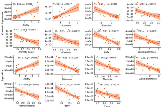 Figure 6 shows association levels of sensory traits with metabolites putatively identified as quercetin 4’-glucoside and trigonelline representing two examples of marker metabolites presented as critical components which confer specific coffee sensory properties. Quercetin 4´-glucoside is an organic compound that belongs to flavonoid o-glycosides, which contain a carbohydrate moiety linked to the 2-phenylchromen-4-one flavonoid backbone by O-glycosidic bond. Quercetin 4´glucoside was found to have a positive correlation with acidity and sourness (SCC: 0.56 and 0.64; p:0.0089 and 0.0017, respectively), whereas a negative correlation was observed for bitterness, flavor, aromatic quality, aftertaste, body and global preference attributes (Figure 6). Some glycosides have been determined as marker metabolites influencing the sensory profile of the coffee beverage. Mozambioside was reported as an Arabica-specific bitter-tasting furokauran glucoside detected in roasted coffee beans and beverage [48], whereas 3-methylbutanoyl glycosides were identified as markers for the quality of coffee flavors [49]. Trigonelline was linked to seven sensory traits, but a positive correlation was observed only for acidity, whereas for aromatic quality, bitterness, body, aftertaste, flavor and global preference, we detected a negative association. It is well-known that 50–80% of trigonelline is degraded by pyrolysis after the roasting process and contributes to the formation of other compounds such as nicotinic acid, pyridine, 3-methyl-pyridine, the methyl ester of nicotinic acid and 1-methylpyridinium [50,51]. All these products of trigonelline degradation finally influence organoleptic features of coffee beverage. Thus, the trigonelline content in roasted coffee beans represents a predictive marker for more than one sensory trait.