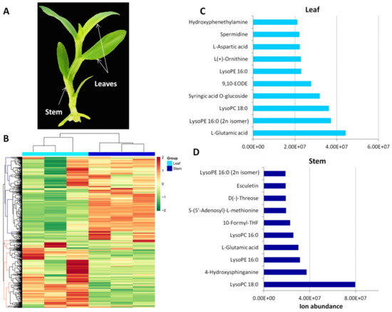 Metabolic profiling in leaf and stem samples of Dendrobium officinale. (A) A picture of D. officinale plant highlighting the two organs used for metabolomic analysis. (B) A heatmap hierarchical clustering of the detected metabolites in leaves and stems. The Log2 of the metabolite quantification was used. The columns correspond to the organs while the rows represent the different metabolites. (C) Top 10 most abundant metabolites detected in leaf samples. (D) Top 10 most abundant metabolites detected in stem samples.
