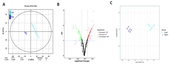Identification of metabolites differentially accumulated in stems and leaves of D. nobile. (A) The partial least squares-discriminant analysis (PLS-DA) score plot. (B) Volcano plot showing the increased and decreased metabolites between leaves and stems. (C) Principal component analysis score plot based on the 206 differential metabolites.