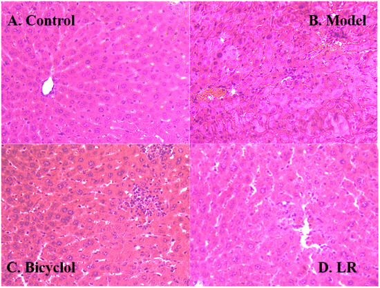 The histology of liver tissue showed obvious differences between the control group and the model group (Figure 2A,B). In the control group, liver lobule structure was neat and liver cells were well-arranged, indicating that the mice were in good condition, although hepatic sinus was slightly expanded. In the model group, liver tissue showed clear signs of a series of injuries, such as liver lobular necrosis, disordered arrangement of hepatic plate, and liver nucleus shrinkage. These further confirmed that the model was successfully established. In comparison with the control group and the model group, liver tissue in the positive control group and the LR group both presented signs of relief from liver injuries (Figure 2C,D). Furthermore, the liver tissue showed a very similar hepatic lobule between the LR group and the control group. However, LR could not fully recover liver functions from the adverse effects of CCl4, given that slight necrosis and inflammatory cell infiltration could still be observed in the LR group.