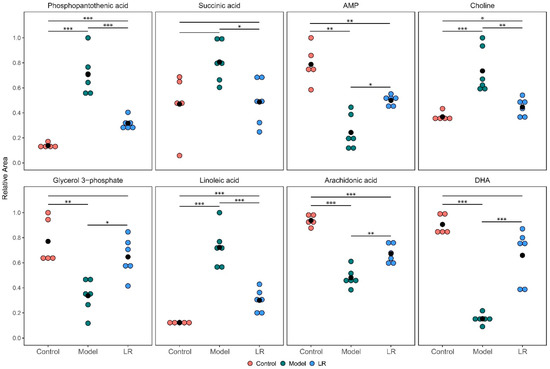 Relative levels of the selected eight metabolites in the liver of mice from the control, model, and LR groups. The hypothesis test for the difference between two means was conducted through t-test. *: p < 0.05; **: p < 0.01; ***: p < 0.001.