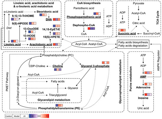 Possible pathways related to the affected metabolites in the liver of mice from the groups of control, model, and LR. The metabolites identified in this study were highlighted in bold, and the eight key metabolites were underlined. Relative levels of identified metabolites were normalized and presented in color (blue—the lowest level; red—the highest level) following the order of control group, model group, and LR group.