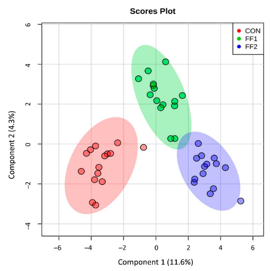 Metabolomic analysis was performed on serum samples taken at baseline and after three months of consuming control food (CON), or one of two functional foods (FF1 and FF2). The sparse partial least squares analysis (SPLS) was used to distinguish between different renal protective food (RPF) groups, and indicated that there were differences between the groups’ changes from baseline, with a greater separation between cats consuming control food and both functional foods (FF1 and FF2) than between FF1 and FF2.