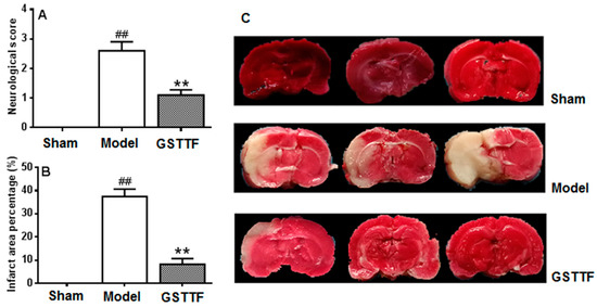 Neurologic score and infarct volume measurement were conducted to evaluate the animal model and the effect of GSTTF for ischemic stroke. As shown in Figure 1A, the rat from the sham group did not have any neurological defect and had a score of zero, while the rats in the model group showed the highest score among the three groups, suggesting a neurological defect after MCAO. After treated with GSTTF, the neurological defect was significantly reversed compared to the model group.