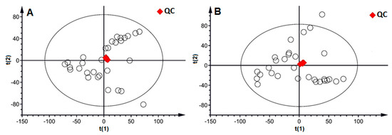 The PCA score plot of all samples (○) with the highlight of the QC (♦) sample in positive ion mode (A) and negative ion mode (B).