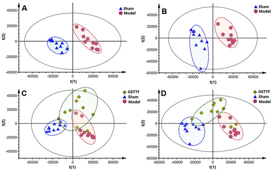The PLS-DA score plots of the sham group (▲), model group (●), and GSTTF-treated group (♦) based on the data acquired in positive ion mode (A,C) and negative ion mode (B,D).