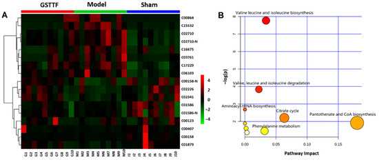 A heat map was constructed using the MetaboAnalyst software [20] based on the intensity of each biomarker to display the overview of the metabolites’ changes in three groups. As depicted in Figure 4A, color differences between model group and sham group indicate the metabolic perturbation after MCAO surgery. Compared to the sham group, the intensities of these metabolites changed in the model group, while in the GSTTF-treated group, the level of these metabolites partly recovered to close to the level in the sham group.
