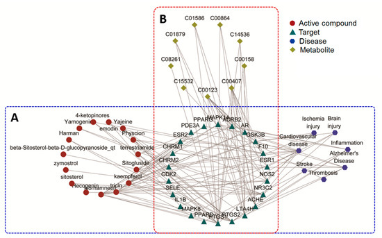 The “compound-target-disease” network (A) and “target-metabolite” network (B) based on 15 compounds, 22 targets, 7 diseases, and 9 metabolites.