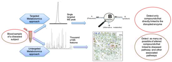 | Main concept | Select specific metabolites (10-100) as targets in LC-MS/MS or direct infusion MS/MS to diagnose a specific disease. Detect fragment ions of these metabolic targets and perform molar quantification using internal standards | Detect all ions within a certain mass range in LC-MS/MS and identify as many metabolites as possible. Use signal intensities of both known and unknown metabolites to characterize diseases phenotypes. Quantification can be aided by quality controls, normalizations, and internal standards. |