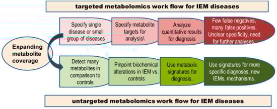 - Sandlers, Y. The future perspective: Metabolomics in laboratory medicine for inborn errors of metabolism. Transl. Res. 2017, 189, 65–75. [Google Scholar] [CrossRef] [PubMed]