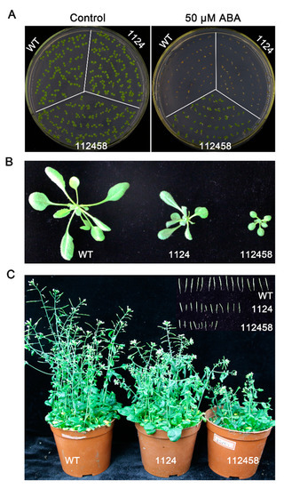 In order to identify the sensitivity to ABA, we detected the germination rates of the wild-type (WT), 1124 and 112458 plants, which were about 3% for WT plants, 50% for 1124 plants, and 100% for 112458 plants (Figure 1A). In addition, 112458 plants showed 100% cotyledon greening, while WT and 1124 plants did not (Figure 1A). These results are consistent with the extreme ABA-insensitive phenotype of the 112458 mutant in germination and seedling establishment assays [16]. In soil, the 1124, and particularly the 112458, mutants showed impaired growth (Figure 1B,C). Compared with the wild type, although lower growth was observed in 1124 and 112458 plants, which lost the function of binding ABA, they were able to flower and produce viable seeds (Figure 1C).