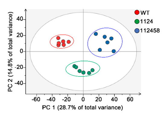 Principal component analysis of metabolite profiles of seedlings from wild-type (WT, red), 1124 (green), and 112458 (blue) plants. Each point represents an individual biological replicate. Plotting of the first and second component is shown. The circles indicate the 95% confidence regions.