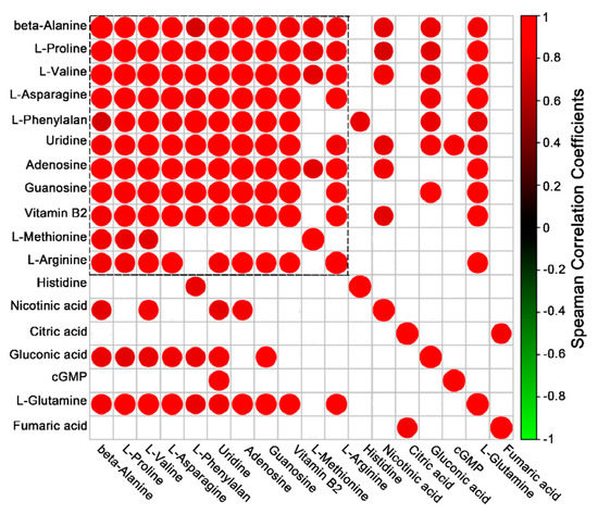 We performed a hierarchical cluster analysis (HCA) using Pearson’s correlation to classify the relationships between the concentrations of the 18 metabolites putatively identified from the 1124, 112458 and wild-type plants. HCA has been used as a means of assessing a relationship among quantitative samples. The HCA results showed the significantly positive correlation among the putatively identified metabolites, including beta-alanine, l-proline, l-valine, l-asparagine, uridine, adenosine, guanosine, vitamin B2, l-methionine and l-arginine (Figure 4). There was no negative correlation found among the detected metabolites. The results showed that compounds from the same class in the biological system that contains amino acids are marked by a dotted box in Figure 4.
