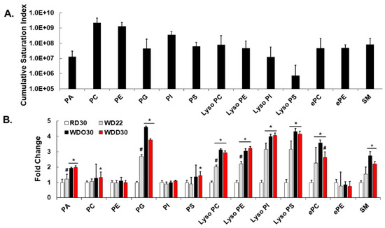 Diet effects on membrane lipids. (A): Cumulative saturation index of lipids in each lipid class. The saturation index (SI) was calculated as follows: one minus (number of double bonds) divided by (number of fatty acyl carbons minus one). The cumulative saturation index was calculated by multiplying the SI by the peak intensity of each lipid species and summing all lipids within each lipid class. (B): Effect of diet on the cumulative saturation index for each lipid class. Results are presented as fold change, mean ± standard error of the mean (SEM); *, q < 0.05 vs. RD30; #, q < 0.05 vs. WDO30; [q-value is the false discovery rate (FDR) adjusted p-value].