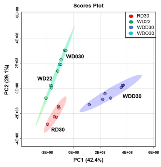 - Chong, J.; Soufan, O.; Li, C.; Caraus, I.; Li, S.; Bourque, G.; Wishart, D.S.; Xia, J. MetaboAnalyst 4.0: Towards more transparent and integrative metabolomics analysis. Nucleic Acids Res. 2018, 46, W486–W494. [Google Scholar] [CrossRef] [PubMed]