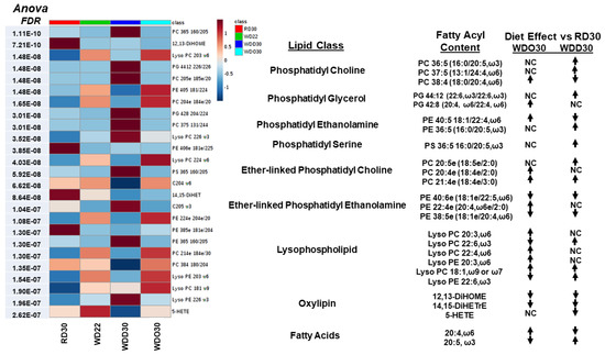 Heat map illustrating diet effects on the top 25 lipid features. As in Figure 3 all lipid data was used to perform an ANOVA (one-way) and a heat map was constructed using the statistical package in Metabolanalyst features [66]. The top 25 highly significant lipid features are illustrated in the heat map. The q-value for each lipid is on the left side of the heat map. Columns at the right list specific lipids within each lipid class that were on the heat map. Arrows indicate the effect of the diet WDO30 and WDD30 when compared to the RD30 group (increase, decrease, no change (NC)) (WD supplemented with either olive oil (WDO) or DHASCO (WDD)).