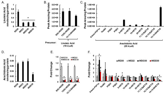 Diet effects on oxylipins derived from ω6 polyunsaturated fatty acids (PUFA). (A,D): Hepatic content of linoleic acid (LA; 18:2, ω6) and arachidonic acid (ARA; 20:4, ω6) as determined by gas chromatographic (GC) analysis. Results are presented as nmoles/mg protein, mean ± SEM. Oxylipins derived from LA (B) and ARA (C) were quantified, by HPLC-dMRM as described in the Materials and Methods Section. Liver samples were derived from the RD group and oxylipin levels are presented as the peak area/mg protein, mean ± SEM. Effects of diet on specific oxylipins are presented in (Panels E,F) as Fold Change, mean ± SEM. (Panels E,F) present LA- and ARA-derived oxylipins, respectively. *, q < 0.05 vs. RD30; #, q < 0.05 vs. WDO30. 9(S)-HODE, 9(S) hydroxyl octadecadienoic acid; 13(S)-HODE, 13(S) hydroxyl octadecadienoic acid; 12,13-DiHOME, 12,13-dihydroxy octadecenoic acid; 6-keto PGF1α, 6-keto prostaglandin F1α; TbxB2, thromboxane B2; PGD2, prostaglandin D2; PGE2, prostaglandin E2, 5-HETE, 5-hydroxyeicosatrienoic acid; 12-HETE, 12-hydroxyeicosatrienoic acid; 15-HETE, 15-hydroxyeicosatrienoic acid; 20-HETE, 20-hydroxyeicosatrienoic acid; 11,12-EpETrE, 11,12 epoxyeicosatrienoic acid; 14,15-EpETrE, 14,15 epoxyeicosatrienoic acid; 14,15-diHETrE, 14,15-dihydroxyeicosatrienoic acid.
