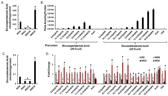 Diet effects on oxylipins derived from ω3 PUFA. Hepatic content of eicosapentaenoic acid (EPA; 20:5, ω3) (Panel A) and docosahexaenoic (DHA; 22:6, ω3) (Panel C). Hepatic EPA and DHA were quantified as described in the Materials and Methods Section and presented as the mean ± SEM of nmoles/mg hepatic protein. (Panels B,D): Effects of diet on EPA and DHA derived oxylipins, respectively. Results are presented as Peak area/mg protein (Panel B) and Fold Change, mean ± SEM (Panel D). *, q < 0.05 vs. RD30; #, q < 0.05 vs. WDO30. 8,9-EpETE, 8,9-epoxyeicosatetraenoic acid; 14,15-EpETE, 14,15-epoxyeicosatetraenoic acid; 17,18-EpETE, 17,18-epoxyeicosatetraenoic acid; 5,6-DiHETE, 5,6-dihydroxyeicosatetraenoic acid; 8,9-DiHETE, 8,9-dihydroxyeicosatetraenoic acid; 11,12-DiHETE, 11,12-dihydroxyeicosatetraenoic acid; 17,18-DiHETE, 17,18-dihydroxyeicosatetraenoic acid; RvE1, resolvin E1; 7,8-EpDPE, 7,8-epoxydocosapentaenoic acid; 10,11-EpDPE, 10,11-epoxydocosapentaenoic acid; 13,14-EpDPE, 13,14-epoxydocosapentaenoic acid; 16,17-EpDPE, 16,17-epoxydocosapentaenoic acid; 19,20-EpDPE, 19,20-epoxydocosapentaenoic acid; 7,8-DiHDPE, 7,8-dihydroxydocosapentaenoic acid; 10,11-DiHDPE, 10,11-dihydroxydocosapentaenoic acid; 13,14-DiHDPE, 13,14-dihydroxydocosapentaenoic acid; 16,17-DiHDPE, 16,17-dihydroxydocosapentaenoic acid; 19,20-DiHDPE, 19,20-dihydroxydocosapentaenoic acid; RvD1, resolvin D1; PDX, protectin DX.