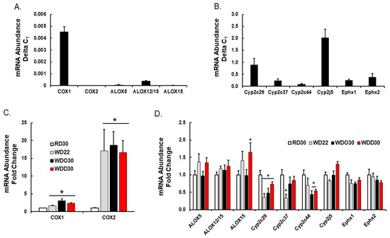 Diet effects on hepatic enzymes involved in oxylipin metabolism. Hepatic RNA was extracted, converted to cDNA and used to quantify transcript abundance using qRTPCR as previously described [52]. The primers used to measure each transcript were previously described [51,60]. Cyclophilin was used as the reference gene. (Top panels A,B): Relative abundance of transcripts encoding enzymes involved in hepatic oxylipin metabolism. Results are presented as delta CT, mean ± SEM. (Lower panels C,D): Diet effects on hepatic transcripts encoding enzymes involved in oxylipin metabolism. Results are presented as Fold Change, mean ± SEM; *, q < 0.05 vs. RD30. COX, cyclooxygenase; ALOX, arachidonic lipoxygenase; CYP, cytochrome P450, Ephx1, microsomal epoxide hydrolase; Ephx2, soluble epoxide hydrolase.