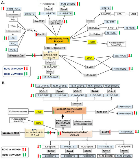 Summary of WD and DHA effects on hepatic oxylipins derived from ω6 PUFA (A) and ω3 PUFA (B). The diagrams illustrate the pathway for the conversion of dietary essential fatty acids to C18-22 PUFA and the conversion of PUFA to oxylipins. The pathways are modified from pathways published by Gabbs et al. [61]. Oxylipins highlighted in blue represent oxylipins that were quantified by LC/MS or gas chromatography (Figure 5 and Figure 6). Enzymes involved in oxylipin metabolism are in gray boxes (Figure 7). Red and green arrows are used to represent the effects (increase; decrease) of the WDO versus RD30 (red arrows) and WDD30 versus RD30 (green arrows) on hepatic abundance of fatty acids, oxylipins, and transcripts involved in PUFA and oxylipins metabolism. Thin and thick arrows represent a weak and strong response to diet, respectively. EFA: essential fatty acids; ROS, reactive oxygen species. Fads, fatty acid desaturase; Elovl, fatty acid elongase; pβOx, peroxisomal β-oxidation; COX, cyclooxygenase; ALOX, arachidonic lipoxygenase; CYP, cytochrome P450, Ephx1, microsomal epoxide hydrolase; Ephx2, soluble epoxide hydrolase.
